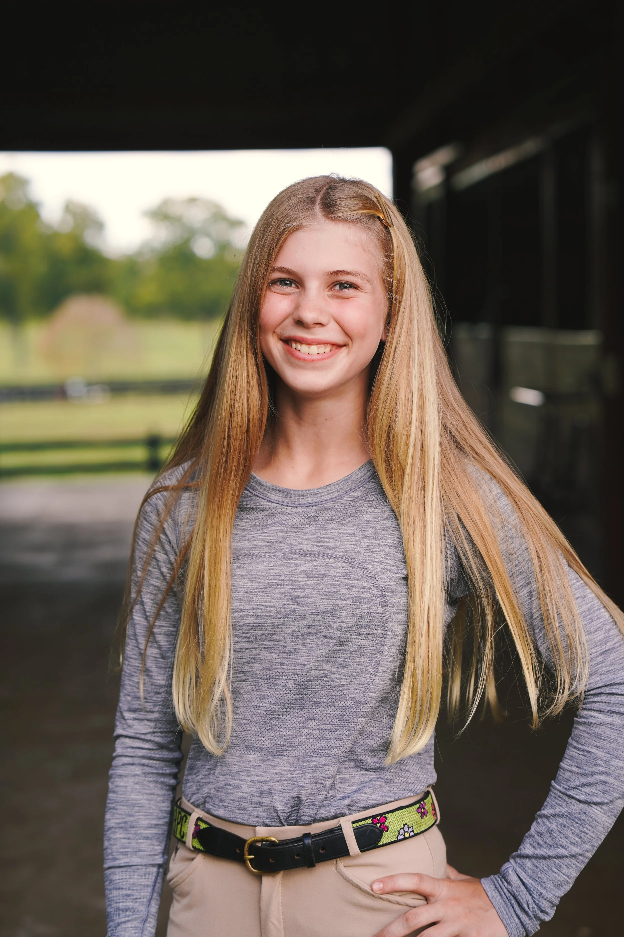 Eva Marie started riding at the age of six. She is currently 13 years old and has earned her title of barn manager. She also helps takes care for the horses here every day. She is extremely organized and knowledgeable. She is a D3 in horse management for Pony Club. She is also a member of the Interscholastic Equestrian Association where she rides for a team. She also takes weekly lessons on her current mount 2Bits, A 24 year old quarter horse mare. She also cares for retired pony a 22-year-old Appaloosa name Stan and his sidekick a miniature donkey named Nachie.
